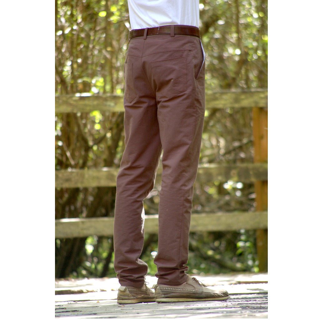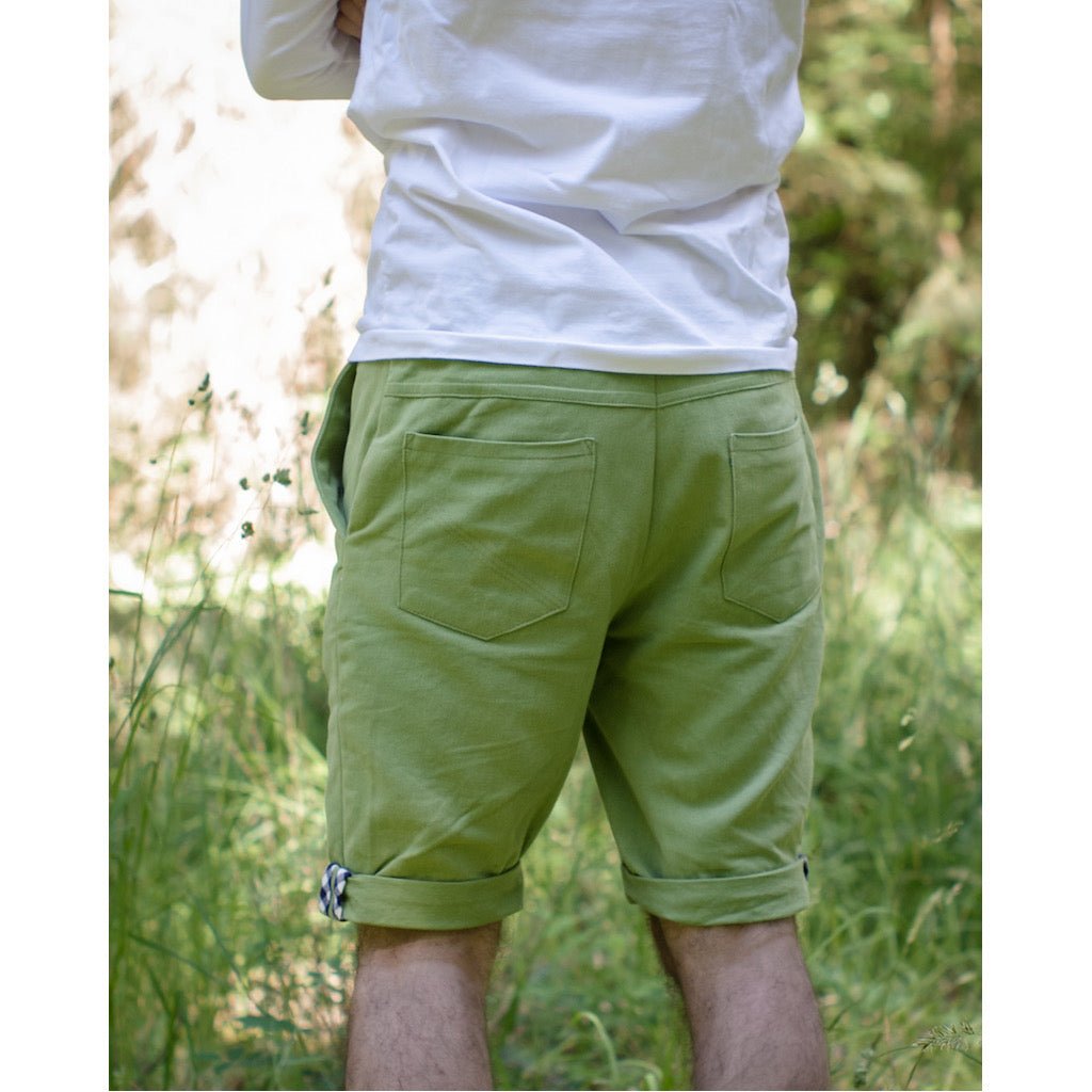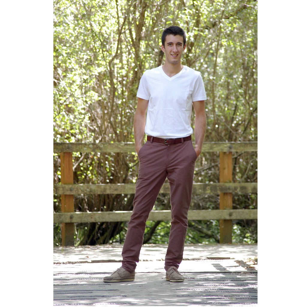 Chino-style trousers updated with a slim, casual fit, back yoke and stylish slash front pockets. These pants include two length options - knee length shorts with rolled cuff and full length trousers. They will wear well in a denim, corduroy or twill with the extra durability of flat fell seams. They could also be made in a lighter cotton or linen when sewn as summer shorts.