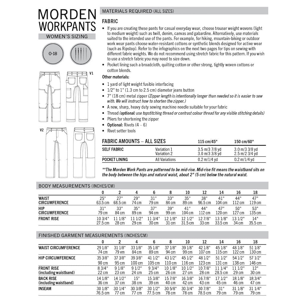 The instructions include many tips on fitting and working with heavy weight materials. Choose between a workwear version with double topstitching and details designed for heavy wear, or a stripped down version that would make excellent activewear trousers in lighter materials.