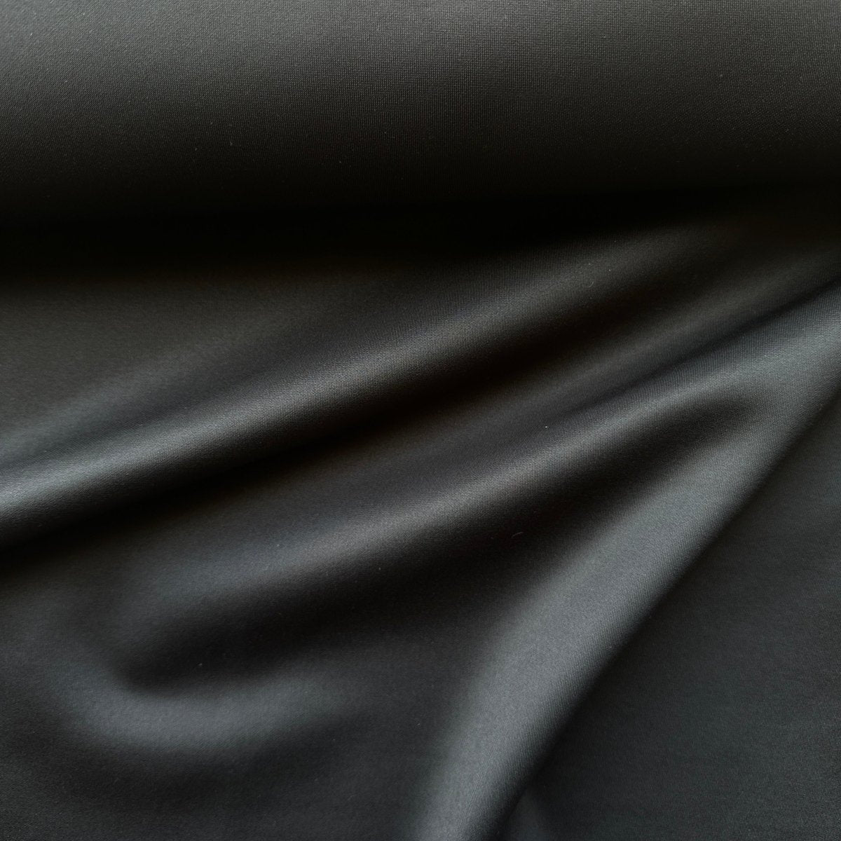 This black jersey has a soft hand, subtle sheen, and a stable weight that gives it great recovery. It stretches about 2" crosswise with minimal vertical stretch, perfect for pull-on garments, soft layering pieces, or even drapey structured knitwear.